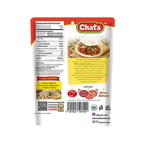 El Chilorio de Cerdo de Productos Chata se presenta en un conveniente pouch de 115 gramos, de fácil apertura. Este producto contiene carne de cerdo, manteca de cerdo, sal yodada, una mezcla de chiles, especias, ajo y vinagre.