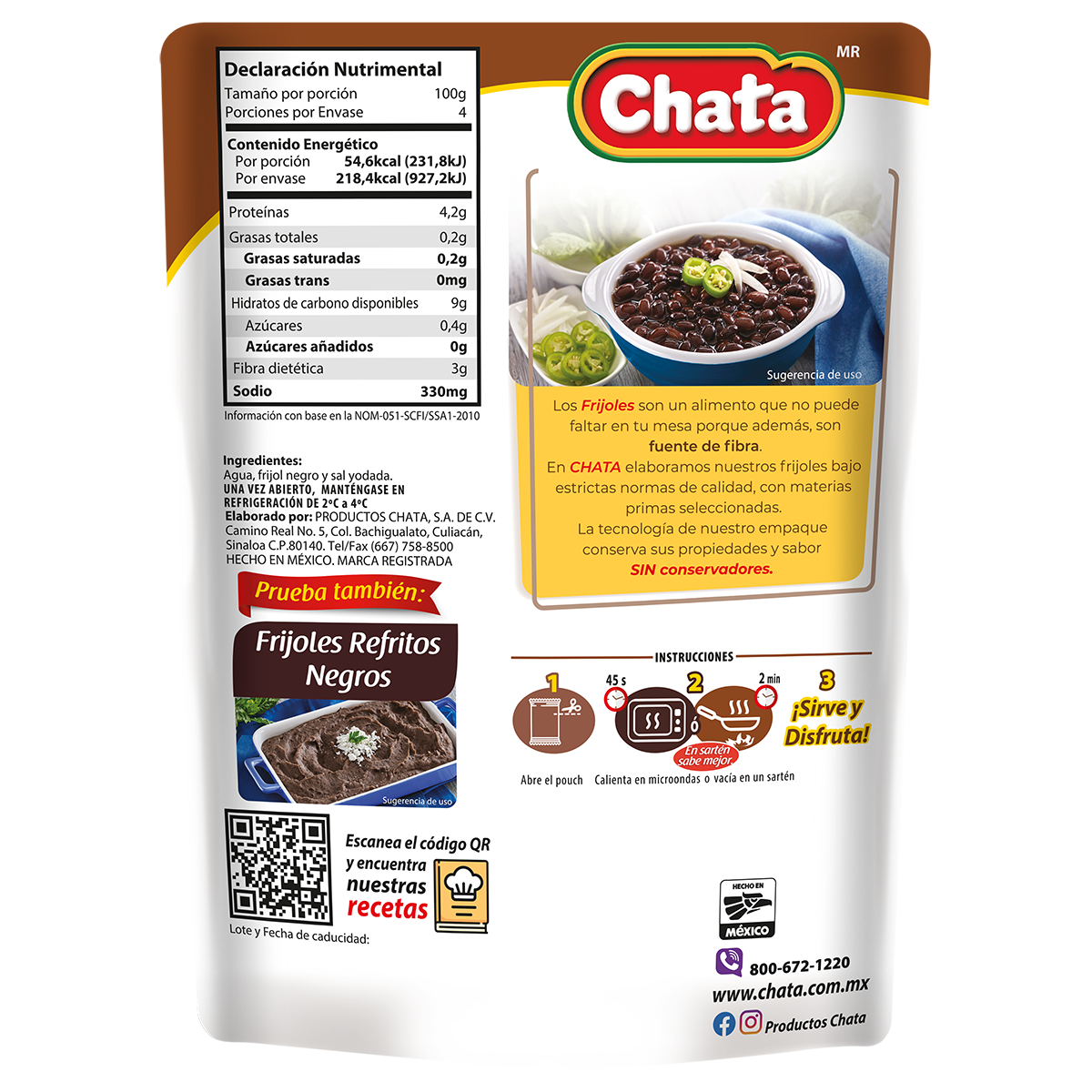 Los frijoles enteros negros Chata, son frijoles de la variedad de frijol negro cocidos con agua y un toque de sal, listos solo para calentar y consumir. Los puedes comer solos o acompañarlos con tu comida.
