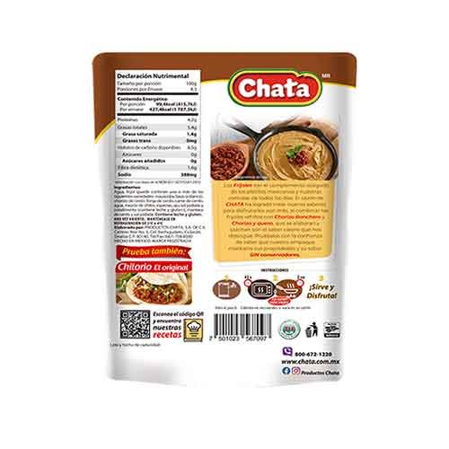 Los frijoles con chorizo ranchero, son un platillo preparado con frijol cocido y refrito al cual se le adiciona chorizo ranchero Chata y manteca de cerdo los cuales le dan un toque de sabor especial, para posteriormente ser envasados en bolsa pouch que son sometidos a proceso de esterilidad comercial lo cual asegura la vida de anaquel a temperatura ambiente. Una vez abierto el envase deberá mantenerse bajo refrigeración.